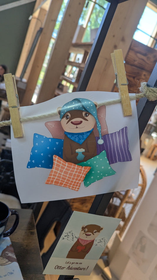Otter-Bügelbild | Cozy Otter | zum selbst Aufbügeln | Otter im Kissenhaufen mit seiner heißen Schokolade