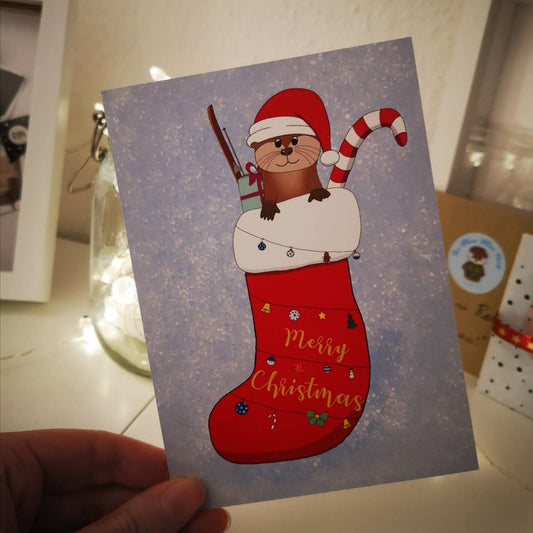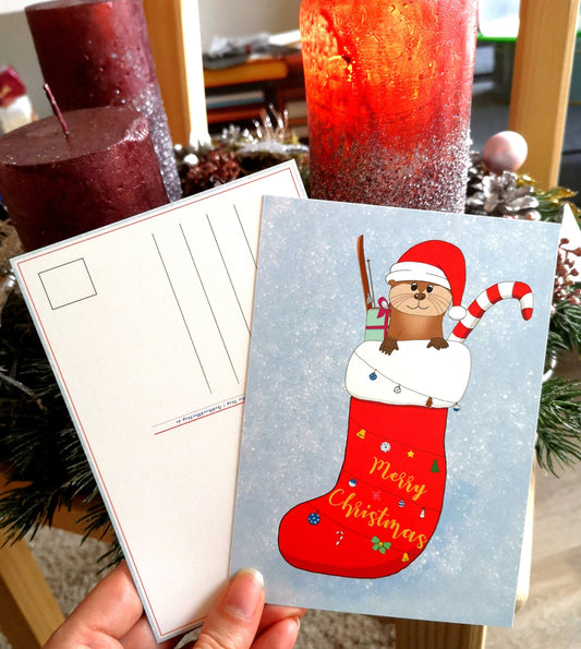 Postkarte Merry Christmas Otter Weihnachten Strumpf A6 | Weihnachtsotter im Strumpf mit Geschenken | The Other Otter Shop